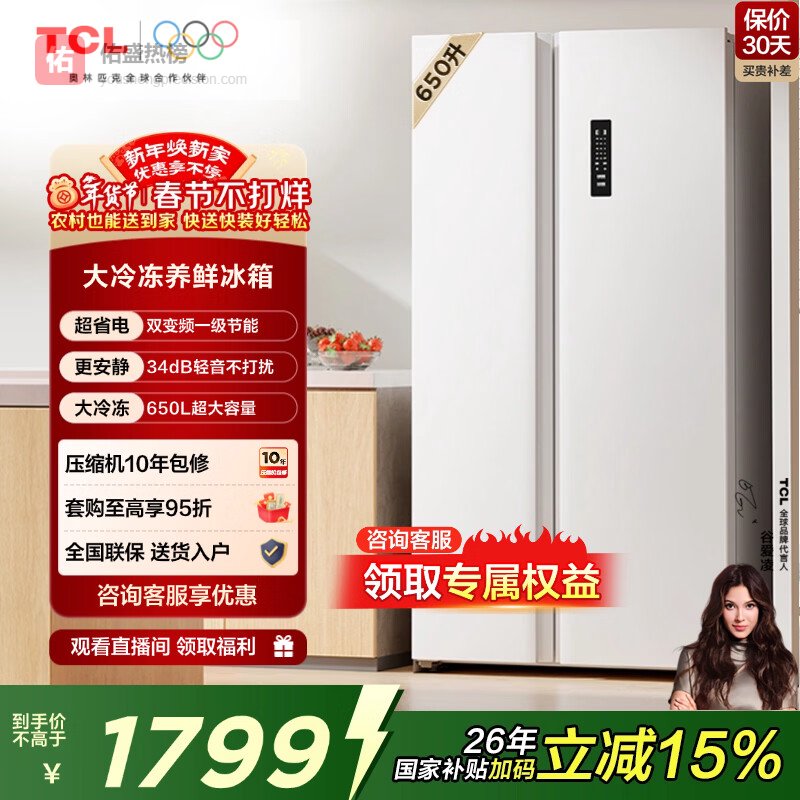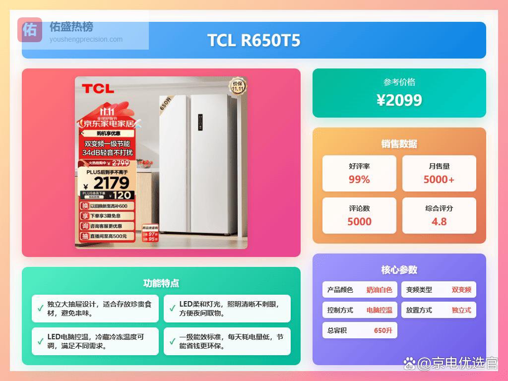 选TCL冰箱啊,首先得看你家人口和饮食习惯。如果家里人多,又喜欢囤货,那600L以上的大容量冰箱绝对是首选,像TCL R650T5-S这种,空间大,分区多,能把各种食材安排得明明白白。另外,还得关注保鲜技术,AAT+负氧离子养鲜或者超低温锁鲜这些功能,能让食材放更久,吃得也更放心。还有就是噪音问题,变频静音的型号,比如TCL R323V7-D或者480升十字对开,用起来是真的安静,不会影响生活品质。