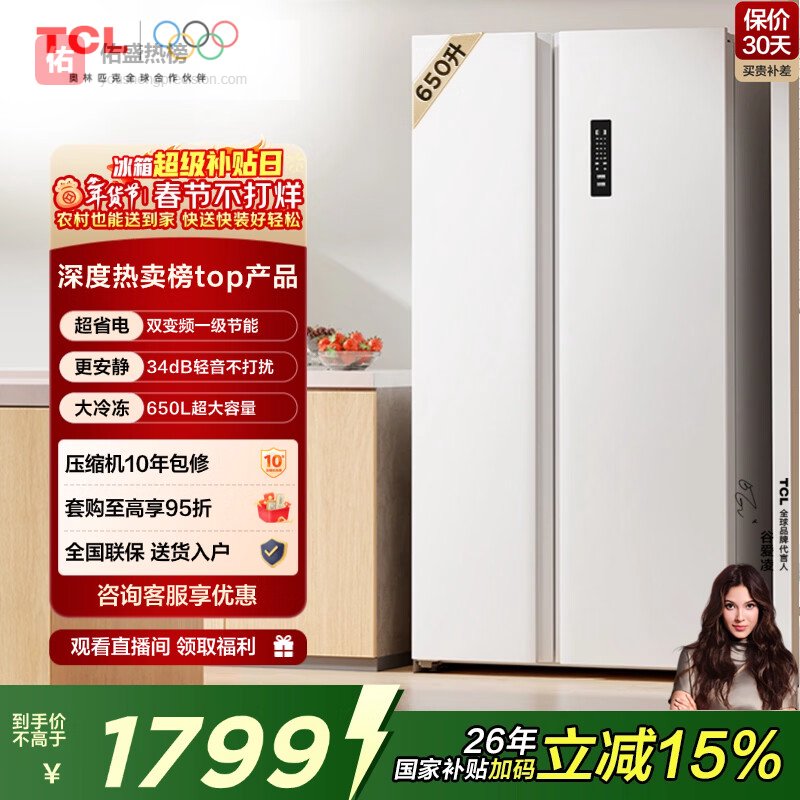 TCL 650L对开门冰箱超大容量大冷冻白色冰箱双变频一级能效风冷无霜家用电冰箱R650T5-S国家补贴¥
