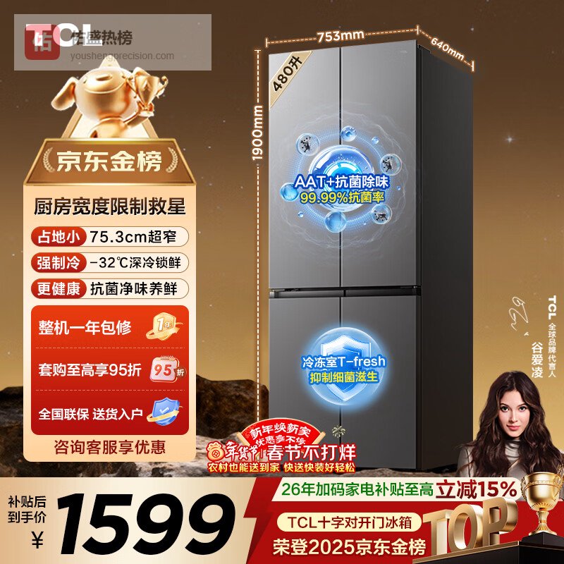 TCL 480L十字门冰箱超窄小户型抗菌净味深冷速冻电冰箱一级能效风冷无霜以旧换新R480V7-U国家补贴¥
