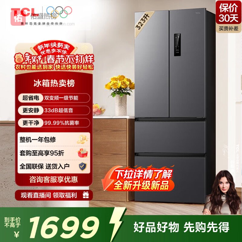 TCL 323L法式多门冰箱双变频一级能效风冷无霜33分贝低音智慧变温家用电冰箱R323V7-D¥