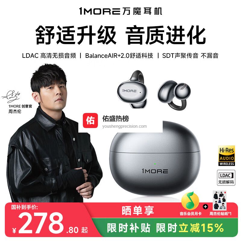 万魔S20采用独特的耳夹式设计,与传统入耳式耳机不同,佩戴时不堵塞耳道,减少耳压,带来更自然的听觉体验。耳夹的记忆镍钛合金材质保证了佩戴的稳固,即使运动过程中也不易脱落。整体轻盈的机身与人体工学设计配合,长时间佩戴亦能保持舒适,适合不喜欢入耳式束缚的用户。