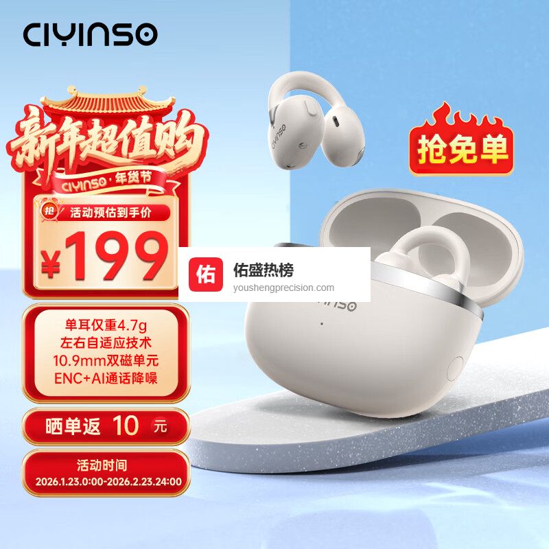 金运A6灵动环采用耳夹式设计,无需入耳,佩戴起来确实很舒适。其独特的扁状分压设计有效分散耳部压力,佩戴时几乎无感,长时间使用也不会觉得累。耳机外观时尚,灵动环的设计让整体更贴合耳廓,稳固性挺不错,特别适合运动时佩戴,不易滑落。