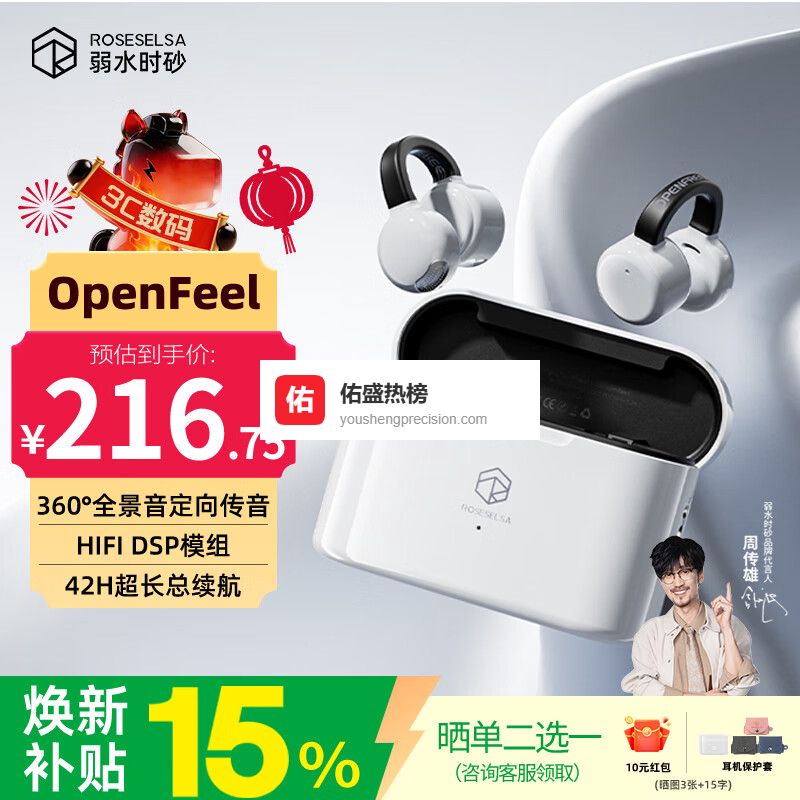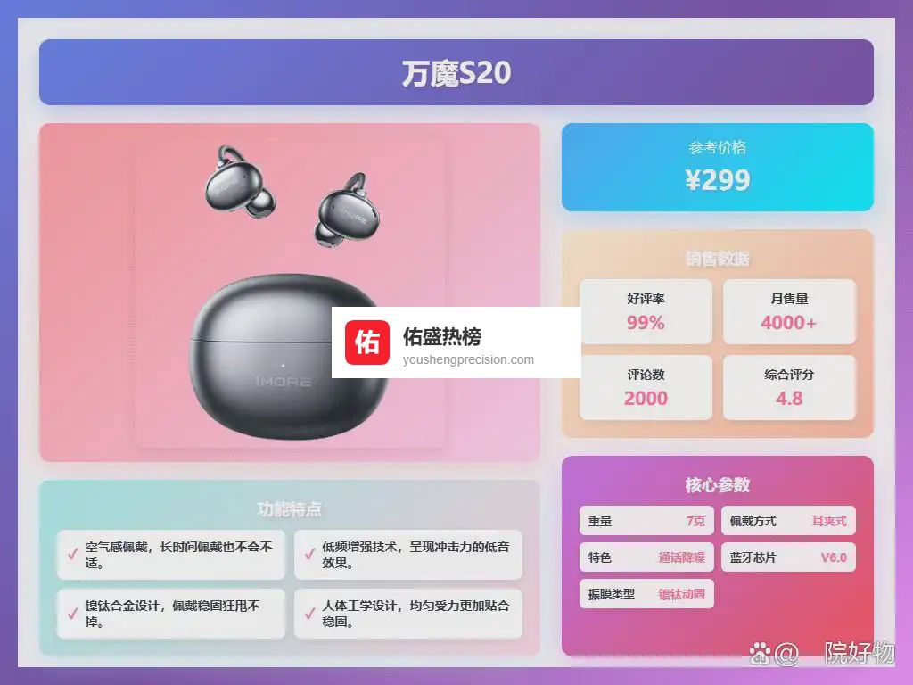 四、弱水时砂弱水时砂作为一个专注于高品质音频设备的品牌,一直致力于将前沿科技和优质材料结合,打造舒适且具有出色性能的无线耳机。品牌注重用户佩戴体验和音质还原,特别是在开放式耳机设计和降噪技术方面表现不俗。弱水时砂通过深入研究人体工学和声音传递原理,为用户提供兼顾日常使用和运动需求的多样化选择,强调自然声音的呈现,确保佩戴舒适和长时间聆听的健康保障。