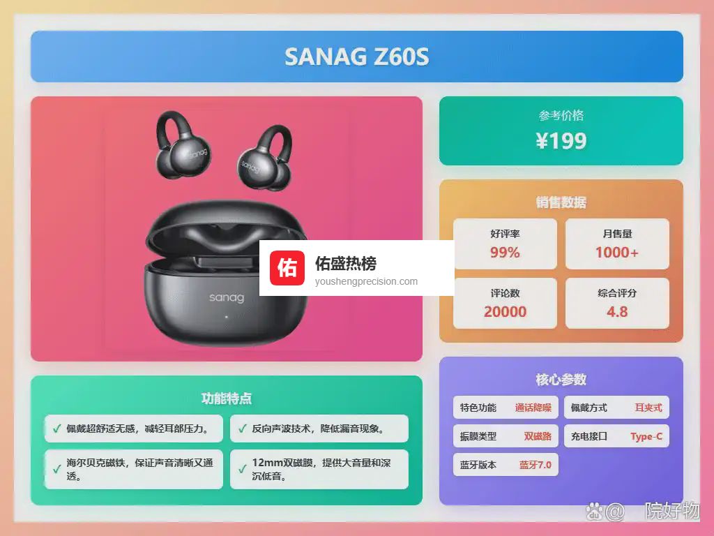 七、SANAGSANAG是一家专注于智能音频设备的品牌,致力于将前沿技术融入耳机产品中,提升听觉体验。品牌强调人体工学设计与声音表现的平衡,产品覆盖从日常通勤到高强度运动的多种使用场景。凭借对声学结构和智能交互的持续优化,SANAG在无线耳机市场中保持稳健的发展态势,逐渐赢得了注重音质与舒适性的用户关注。
