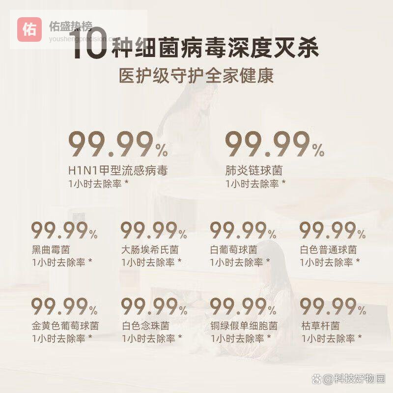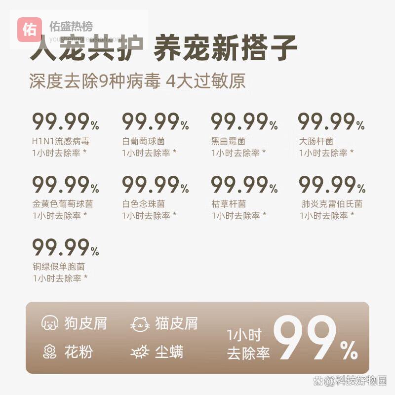 不仅如此,设备在运行时噪音低至31dB(A),即便是在夜晚使用也不会打扰到您的睡眠。此外,强大的过滤系统有助于消灭99.99%%的细菌病毒,有效去除猫狗皮屑、花粉及尘螨,确保您的家完全符合健康标准,是养宠家庭的理想选择。