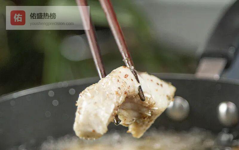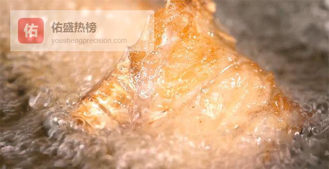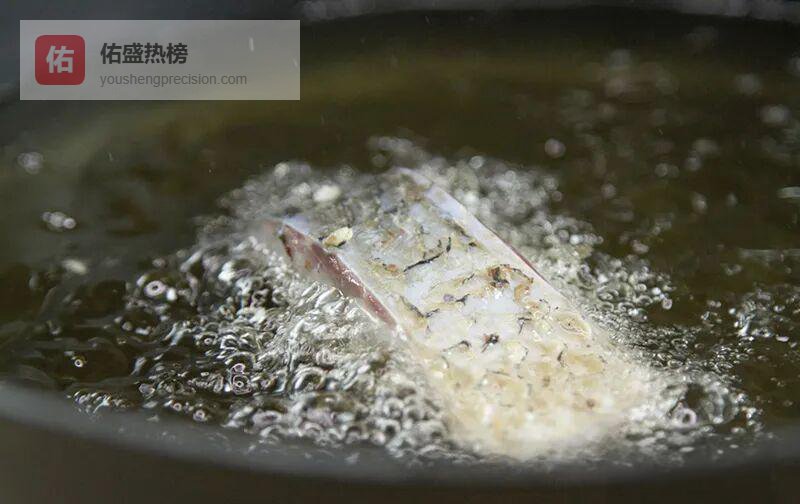 3.3 > 初炸:160℃的温柔“暴击” 腌好的鱼用厨房纸吸干水分,油温160℃时下锅。一次成型不翻动,金黄即捞;油温再回160℃,二次复炸,让气泡在表皮开“烟花”,焦脆层瞬间封顶。