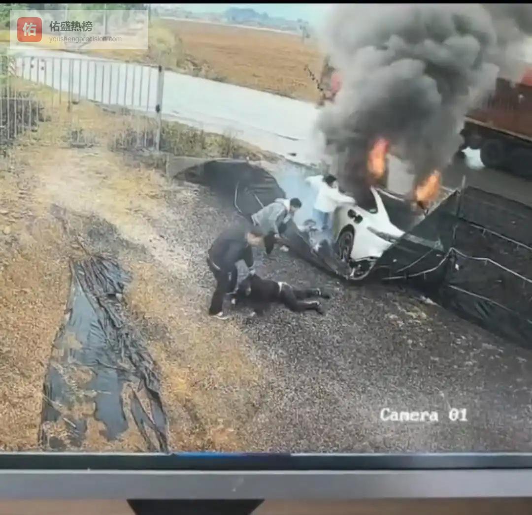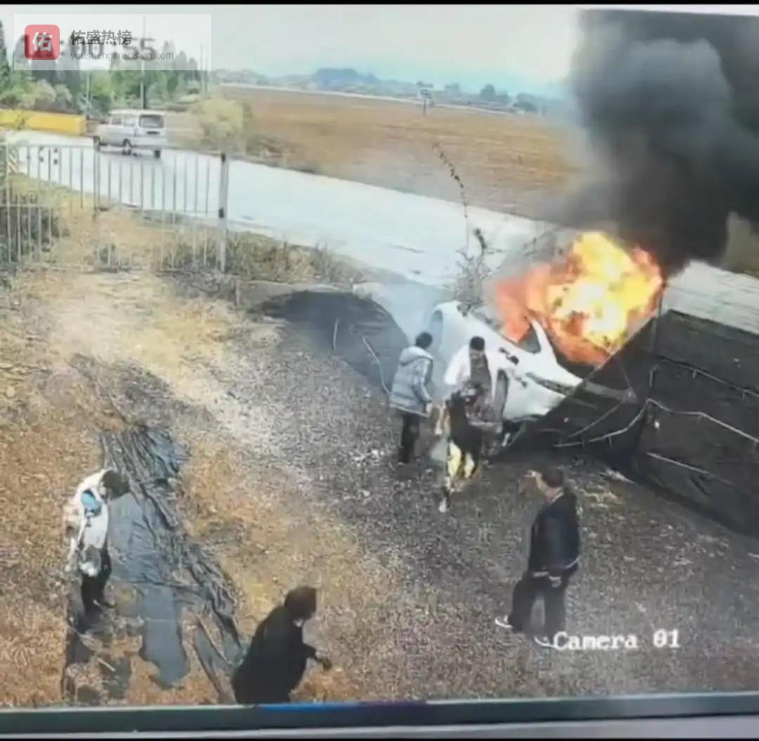 可让人没想到的是,在他倒车10秒钟后,一辆由戴某某驾驶的云AD*****号小型轿车,突然正面撞上了货车的右后侧,路面上甚至没有留下任何刹车痕迹。剧烈的碰撞后,小轿车直接驶出有效路面,随后瞬间起火燃烧,火势蔓延极快,很快就将整个车身吞噬。