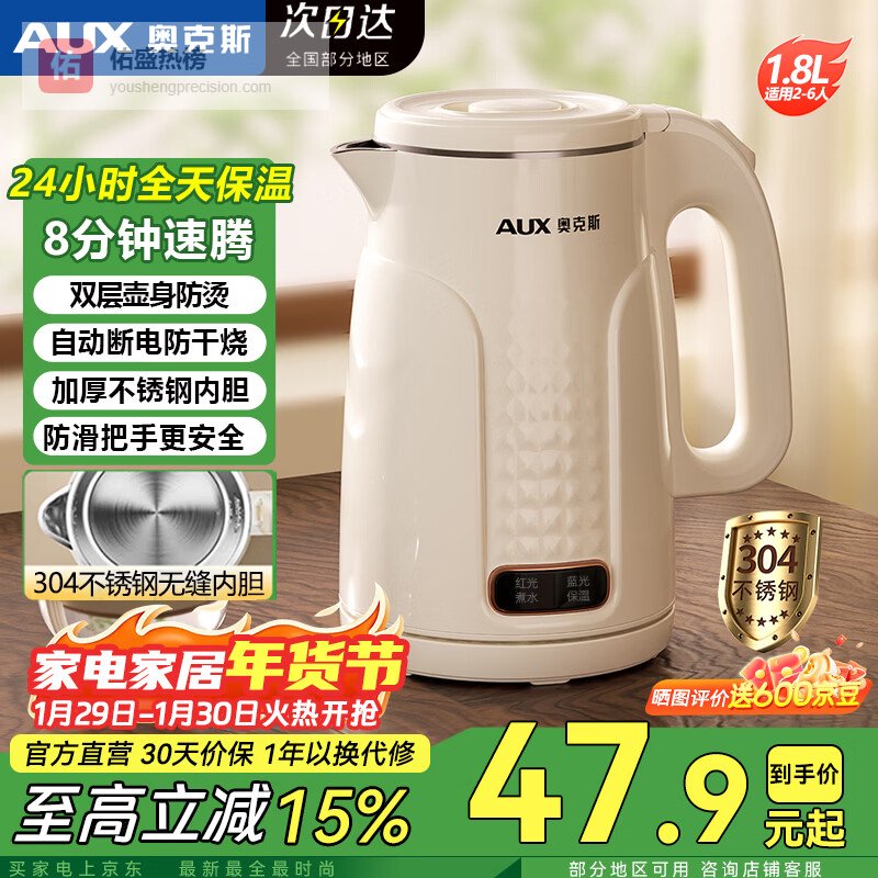 奥克斯(AUX)电热水壶家用大容量烧水壶暖水壶开水壶恒温壶电水瓶304不锈钢0胶水电水壶双层防烫保温壶 1.8L 升级保温款【保温24小时】304不锈钢 有家的地方就有奥克斯¥
