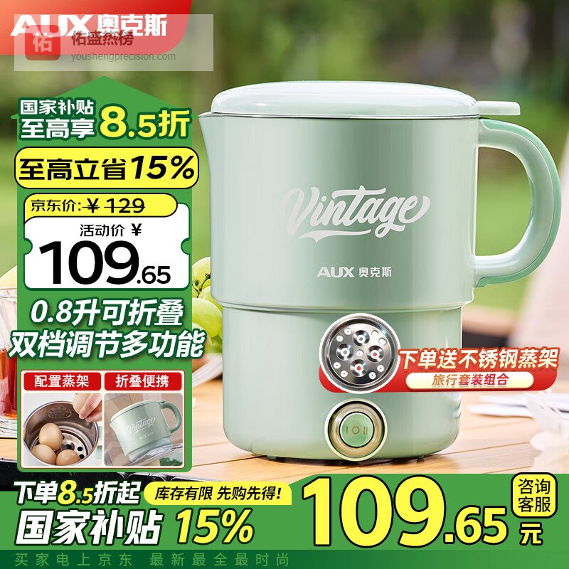 奥克斯(AUX)便携式烧水壶 316L不锈钢折叠水壶烧水旅行电水壶 家用烧水杯养生冲奶保温 HX-A0803E 0.8L 含蒸架款¥