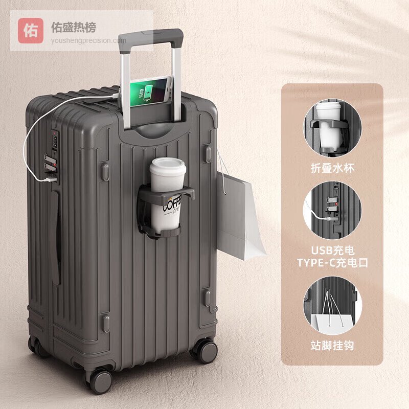 此行李箱设有USB双充电口,方便您在旅途中随时为电子设备充电,提升出行的便利性。此外,折叠杯架的设计也大大增强了带来用户的舒适体验,让你尽情享受每一个旅途瞬间。