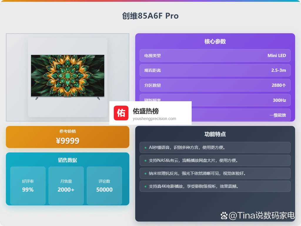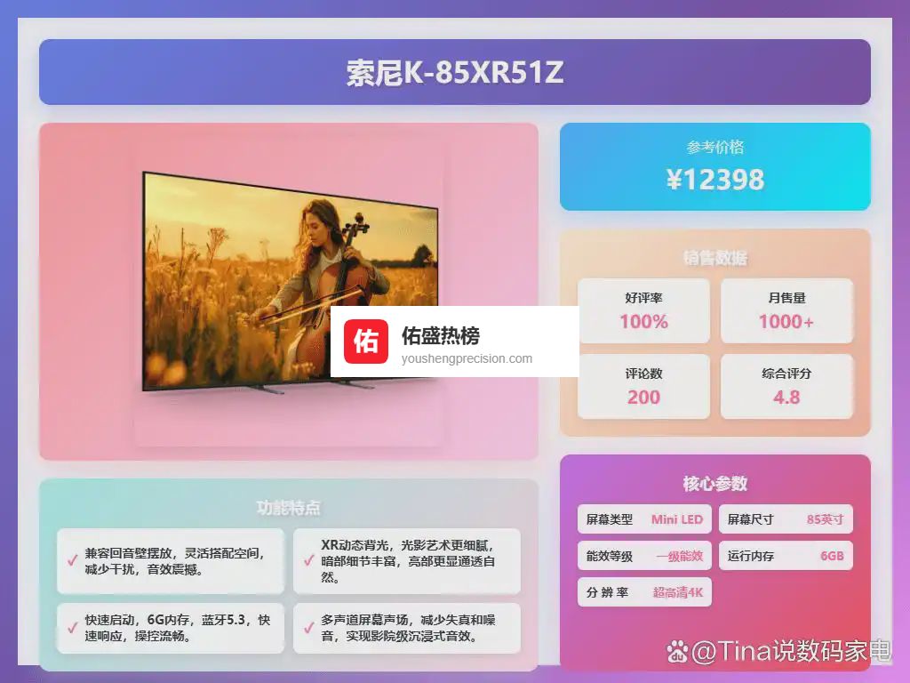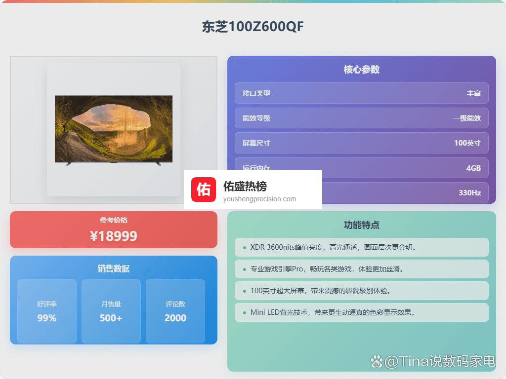 十、东芝这款东芝100Z600QF平板电视配备了98英寸超大屏幕,带来像影院一样的视觉享受。采用Mini LED背光技术,实现细节还原和动态画面表现的提升,画面层次感更丰富,即使在暗场景下也能清晰观看。用户试了下,色彩自然,久看也不眼睛疲劳,确实挺舒适的选择。