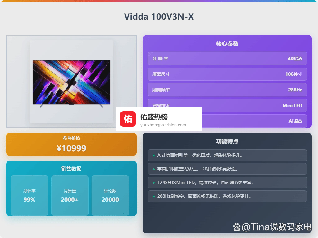 九、Vidda这款Vidda 100V3N-X电视配备了1248分区的Mini LED背光技术,可以实现精准控光,让画面细节更丰富。它的亮度高达2400nits,支持95% DCI-P3色域,无论是明亮的日光场景还是暗黑的电影画面,都能呈现出鲜明的色彩和丰富的对比度,提升整体观影体验。