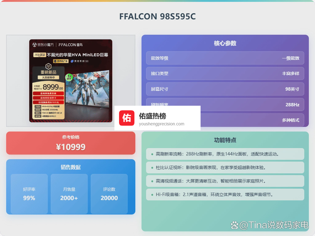 2026年万元以上电视机哪款好,这几个品牌公认值得买一、FFALCON这款FFALCON 98S595C Ultra平板电视配备了MiniLED显示技术,具有1152个独立控光区,能够实现更精准的亮度调节。峰值亮度高达2000nits,细节表现细腻丰富,暗部细节也能呈现出深邃纯净的黑色。实测色彩还原挺自然,即使在白天观看也没有明显反光,视觉体验不错。