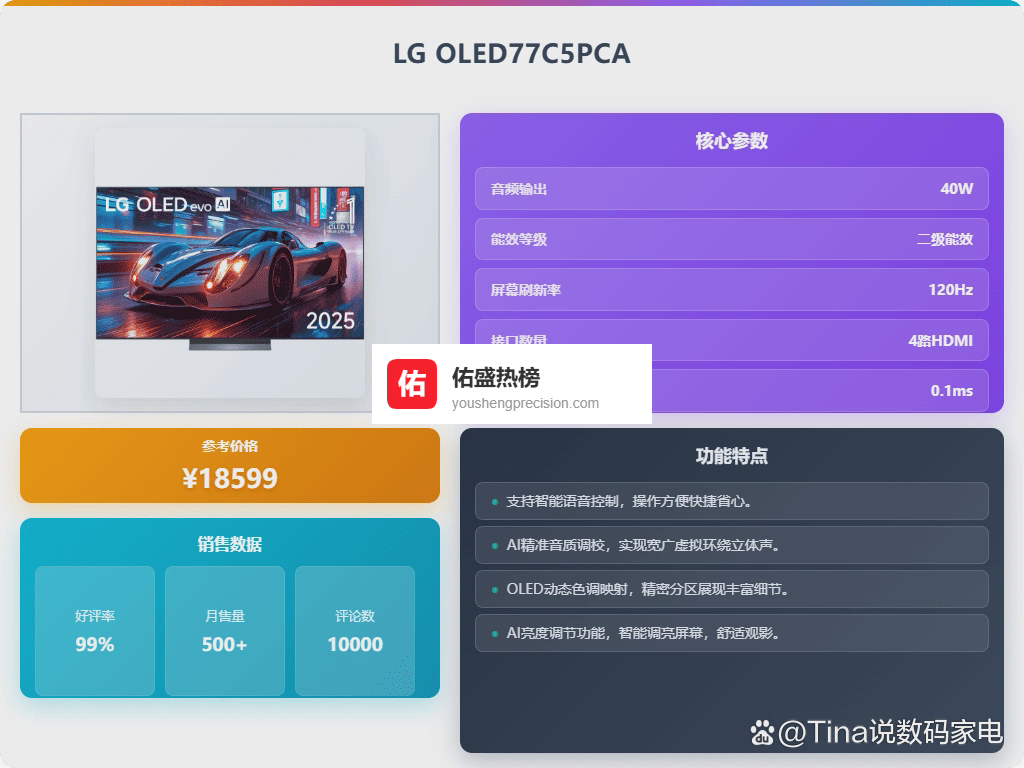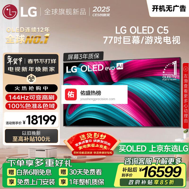 八、LG这款LG OLED77C5PCA配备了OLED evo面板,实现每个像素的自主发光,带来极致的黑色表现和高对比度,细节表现非常清晰。色彩表现同样出色,能还原丰富、真实的色彩,无论明暗环境都能保持良好的色彩一致性。观看电影或者玩游戏时,画面稳定、细腻度高,能带来震撼的视觉体验。
