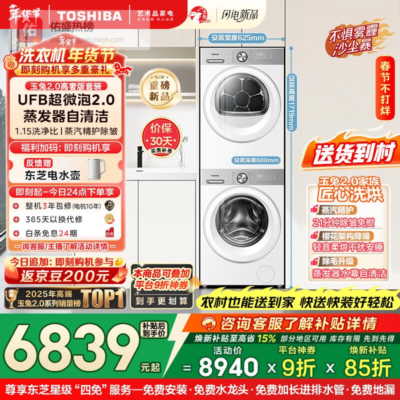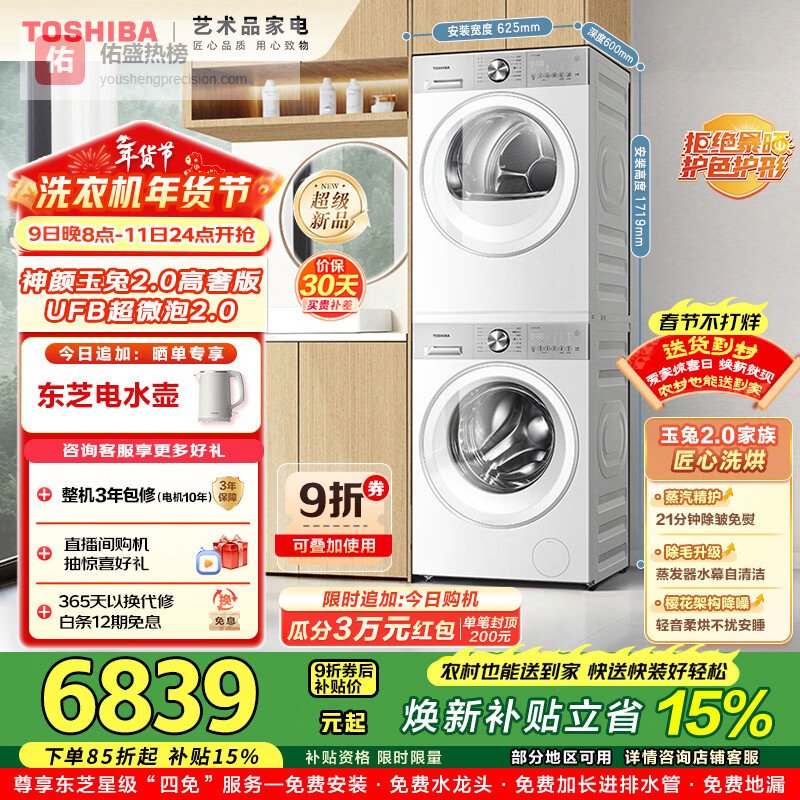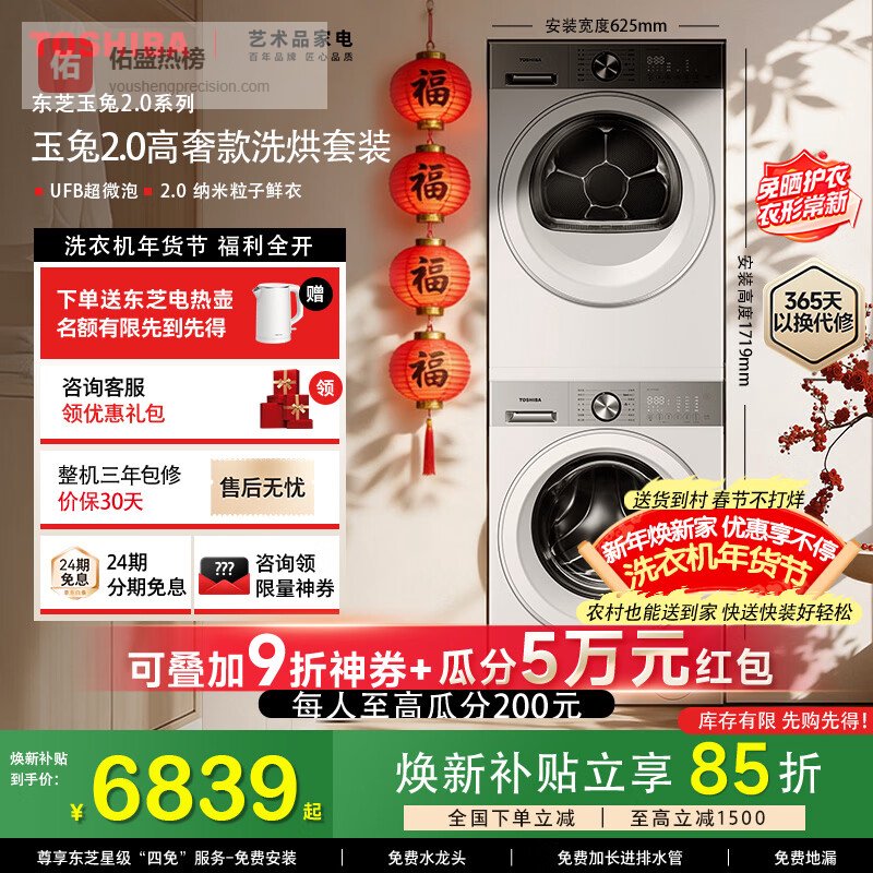 【京东自营】东芝玉兔2.0高奢版洗烘套装10公斤滚筒全自动洗衣机家用+变频热泵烘干机UFB超微泡DG¥