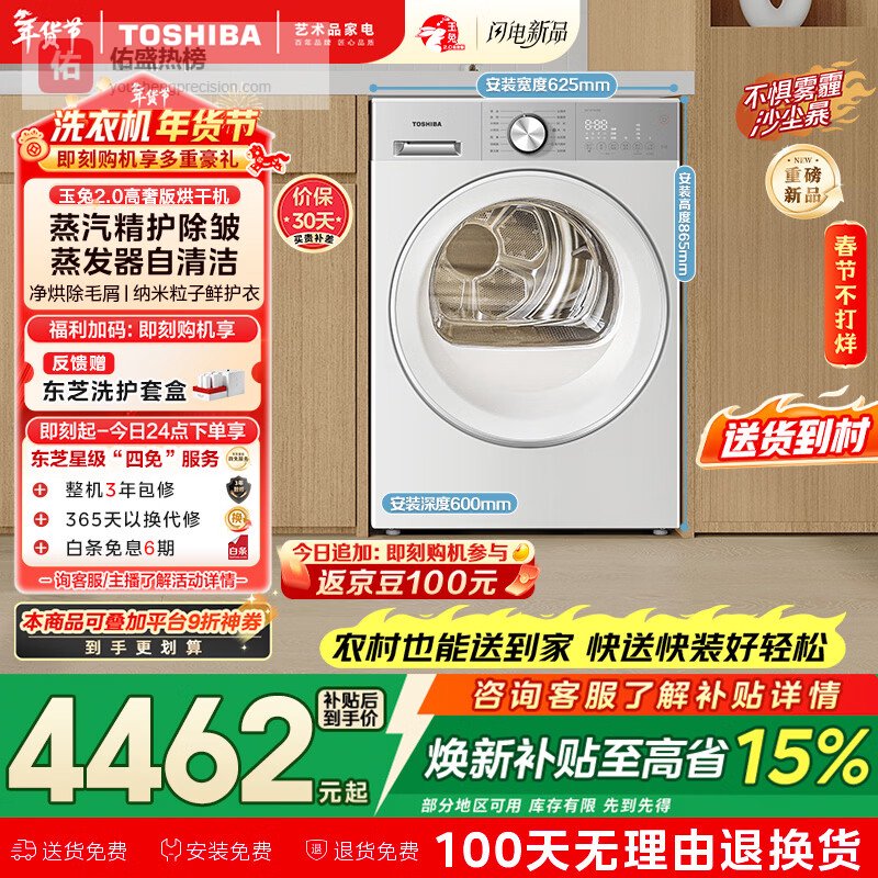 【京东自营】东芝玉兔2.0高奢版热泵烘干机家用10公斤大容量纯平全嵌蒸发器自清洁蒸汽精护DH-10T¥