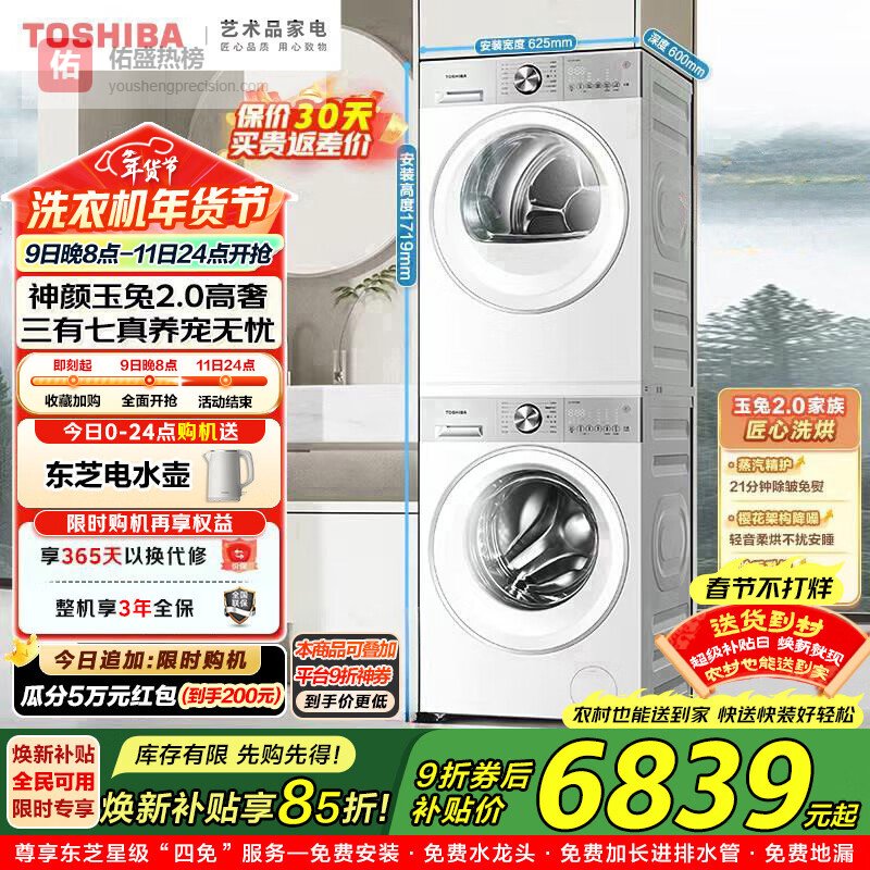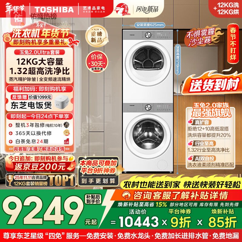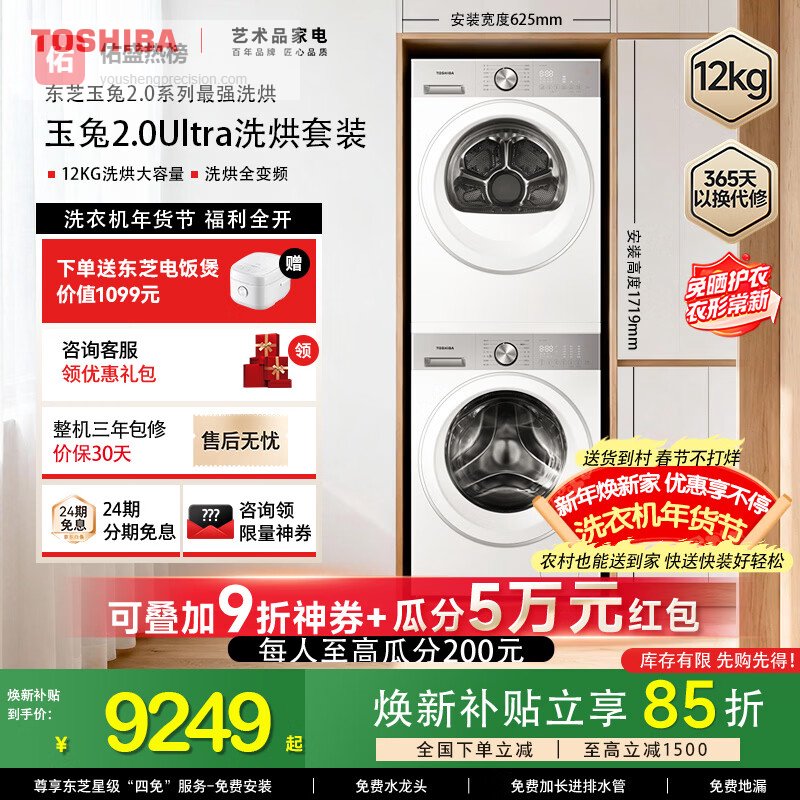【京东自营】东芝玉兔2.0Ultra洗烘套装12公斤大容量滚筒洗衣机+变频热泵烘干机超微泡全变频蒸汽¥