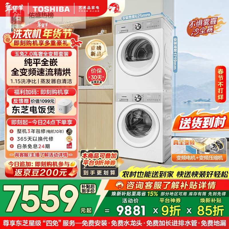 【品牌直营】东芝【官方旗舰店】玉兔2.0Ultra新品纯平全嵌洗烘套装12KG大容量滚筒洗衣机烘干机¥