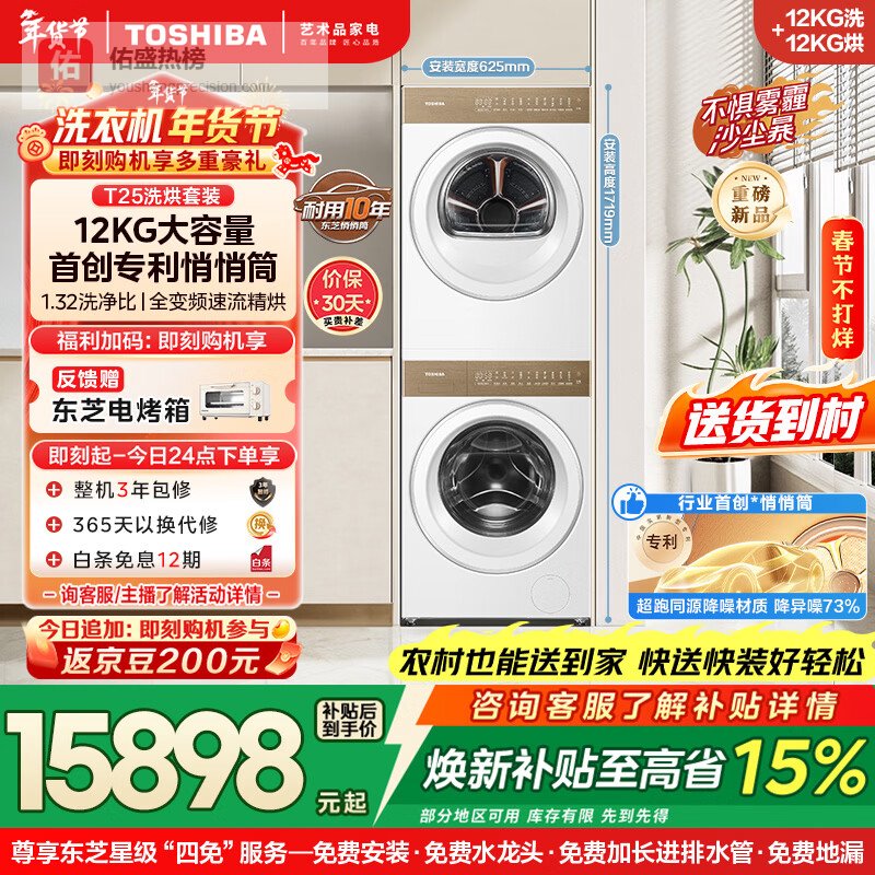 【京东自营】东芝T25热泵洗烘套装12公斤大容量滚筒全自动洗衣机+变频热泵烘干机全变频悄悄筒DG-1¥