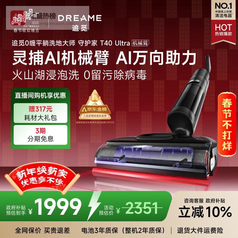 【京东自营】追觅春晚同款守护家洗地机T40Ultra0水渍【AI机械臂三贴边】180°平躺毛发防缠干¥