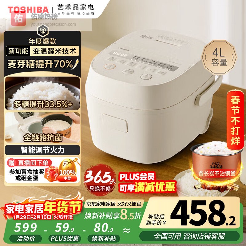 东芝(TOSHIBA)鲜米电饭煲4-5人 变温醒米技术家用不粘智能预约4升备长炭电饭锅三维立体加热 RC-15DHUC(WY)¥