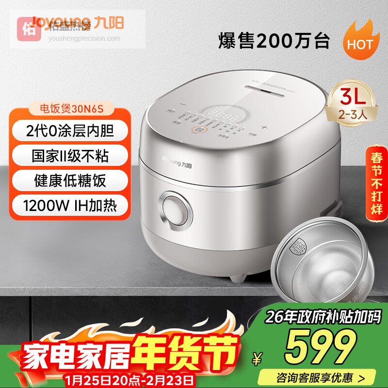 九阳(Joyoung)【2代0涂层】3升2-3人低糖电饭煲电饭锅风冷水润膜IH加热316L不锈钢胆无涂层10A米饭30N6S¥