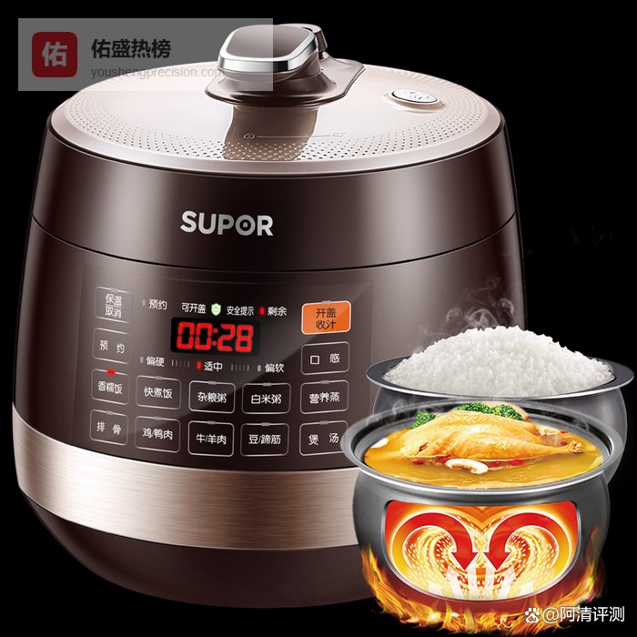 3、安全智能,贴心便捷:安全方面,它有五重防护,一键排气,防堵螺母,预约功能,让你完全不用担心煮饭过程中的安全问题。而且,24小时智能预约定时,到点就能享受新鲜美食,真是太方便了!304食品级不锈钢内盖和密封圈,清洗起来也超轻松。