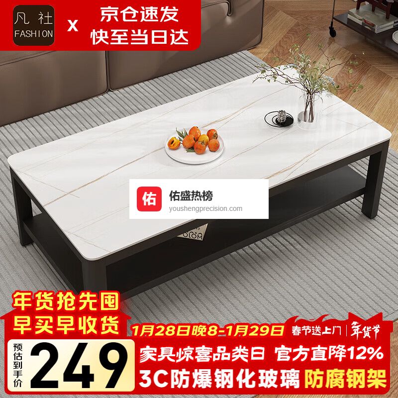 凡社 茶几客厅简约现代 钢化玻璃仿岩板大理石纹双层储物办公茶桌¥