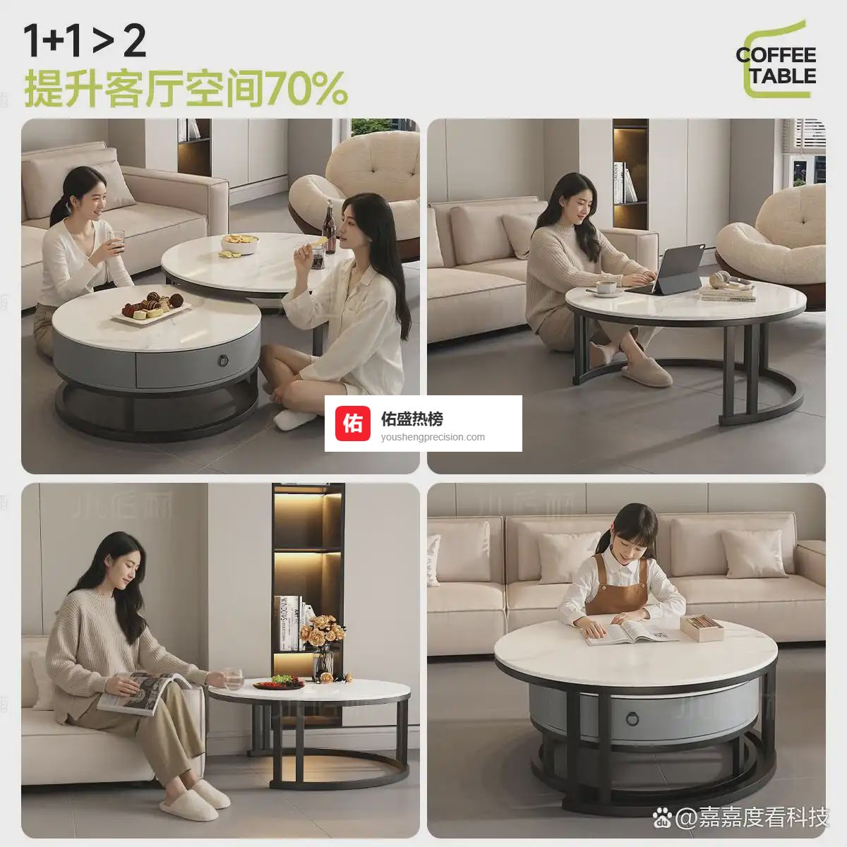 三节金属滑轨,采用耐磨五金,低噪音,越用越顺滑。全通体岩板,加粗加厚的滚珠轨道,让茶几在移动中更加自如。这款茶几不仅是一款实用家居单品,更是您家居空间中的点睛之笔。它的存在,能让您的家更加温馨,生活更加美好。