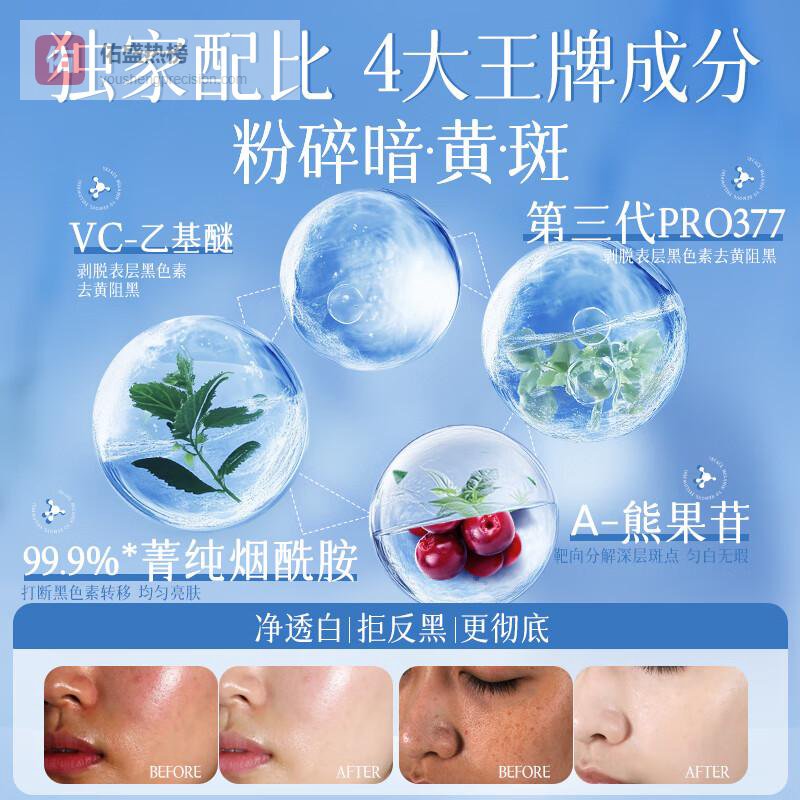 1️⃣焕彩美白效果显著:蕴含烟酰胺和光果甘草成分,快速提亮肌肤,帮助改善暗沉问题。只需短短10分钟,能有效淡化面部斑点,赋予肌肤自然光泽,令人焕然一新。