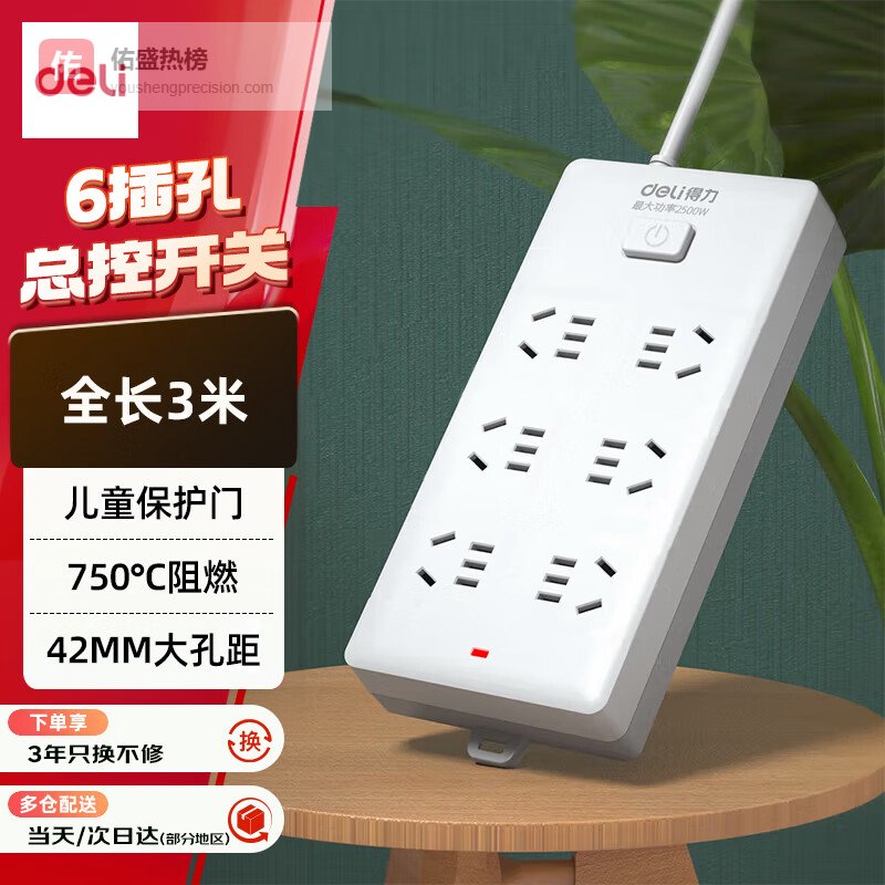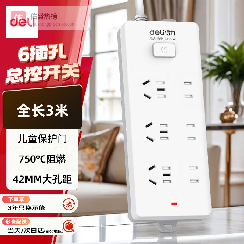 得力(deli)3C认证国标安全插座/插排/插线板/接线板/排插/拖线板 总控开关 儿童保护门 6组合孔3米 18260¥