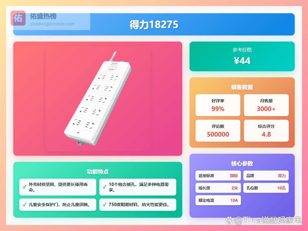 选购得力国标插座,首先得看你的实际需求哈!如果你是家用,特别是家里有小朋友的,那儿童安全保护门绝对是刚需。像得力18256、得力LU9053、得力33971这几款都带有安全门设计,能有效防止孩子误触。另外,插座的孔位数量也很重要,根据你平时需要同时使用的电器数量来选择,像得力33916和得力18275这种多孔位的,用起来就比较方便,不用来回拔插头。还有,插座线的长度也要考虑,得力18260有3米长的线,灵活度更高,能满足不同场景的需求。总的来说,安全、实用、够用,这三个方面都要考虑到哦!