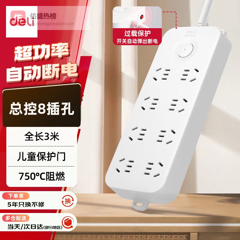 得力(deli)雅白系列国标插座 插线板/插排/排插/接线板/拖线板 超功率保护防过载 总控8位3米 33971(03)¥
