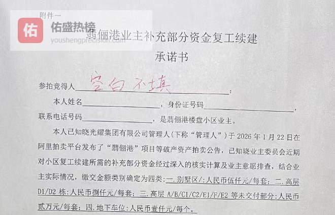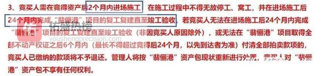 为保障翡俪港顺利重启,本次拍卖设置了时间条款与违约约束。竞买人需在竞得资产后2个月内进场施工,并在进场施工后24个月内完成“翡俪港”项目的复工复建直至竣工验收。若竞买人无法在进场施工后24个月内完成“翡俪港”项目的复工复建直至竣工验收,或无法在“翡俪港”项目取得全部不动产权证之后6个月内付清全部拍卖款项的,已缴纳的款项将不予退还。管理人将按“翡俪港”资产包现状重新进行处置,竞买人对“翡俪港”资产包不享有任何权利。