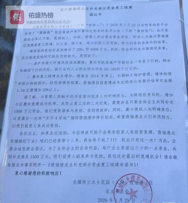 为保证此次竞拍成功,翡俪港业主还众筹了部分复建资金。此前,翡俪港小区业委会发布了《关于翡俪港业主补充部分资金复工续建倡议书》,呼吁全体业主共同筹集1500万元资金,作为复工续建的补充资金。
