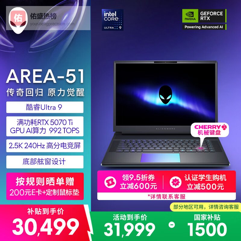 外星人(Alienware)游戏本国家补贴AREA-51 16英寸高性能笔记本电脑5070Ti显卡酷睿Ultra 9 32G 1T 2.5K 240Hz 1972QT¥
