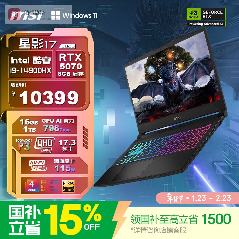 微星(MSI)星影17 2025 国家补贴 17.3英寸游戏笔记本电脑(酷睿i9-14900HX RTX5070 16GB 1T 2.5K 240Hz )¥