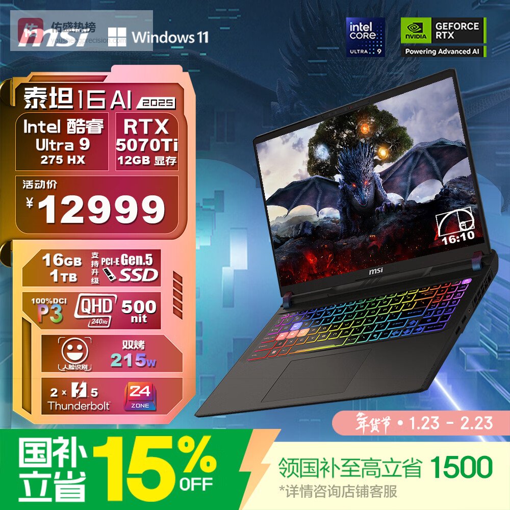 微星(MSI)泰坦16 AI 2025 国家补贴 16英寸游戏笔记本电脑(Ultra9-275HX RTX5070Ti 16G 1TB 2.5K/240Hz)¥