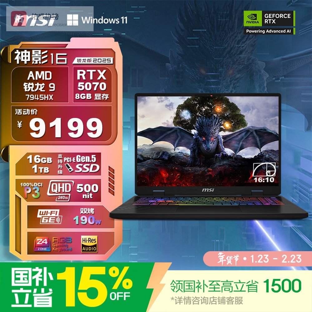 微星(MSI)神影16 锐龙版 2025 国家补贴 16英寸游戏笔记本电脑(锐龙9 7945HX RTX5070 16G 1TB 2.5K/240Hz)¥