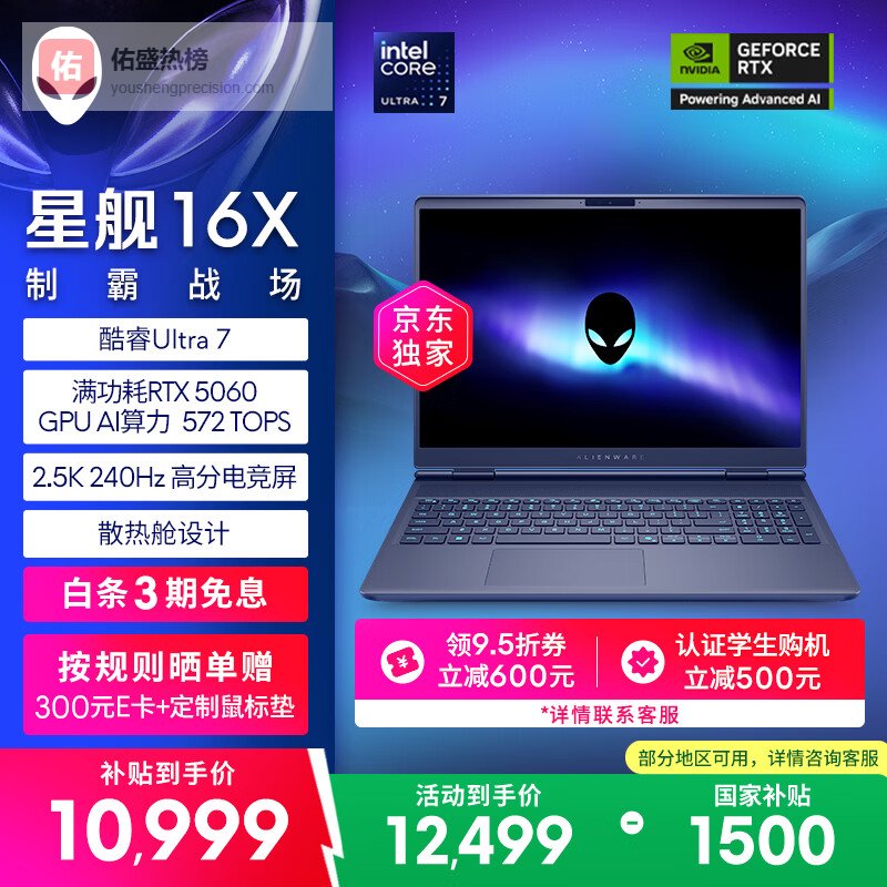 外星人(Alienware)游戏本国家补贴 星舰16X 16英寸高性能笔记本电脑 酷睿Ultra 7 5060显卡16G 1T 2.5K 240Hz 1761QB¥