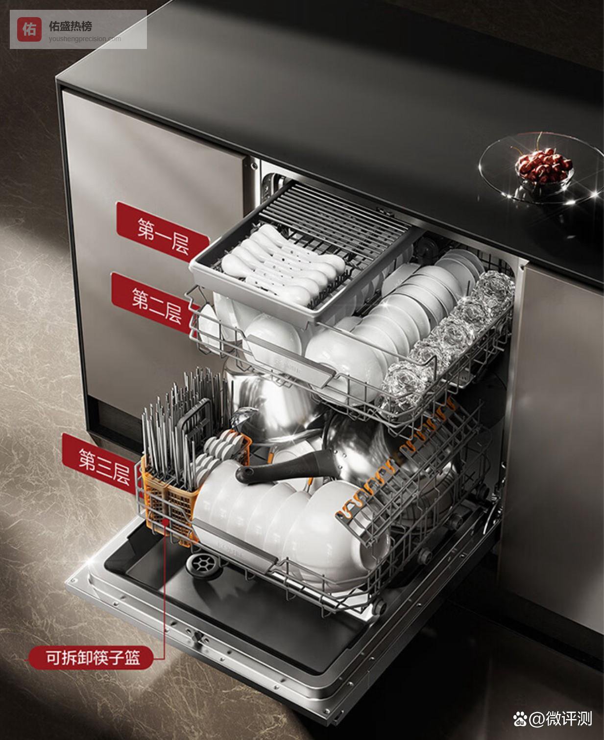 灵动碗篮布局:独特的三层碗篮设计,可调节与滑动,自由适配不同大小餐具,使用更加便捷,让清洁更无忧。