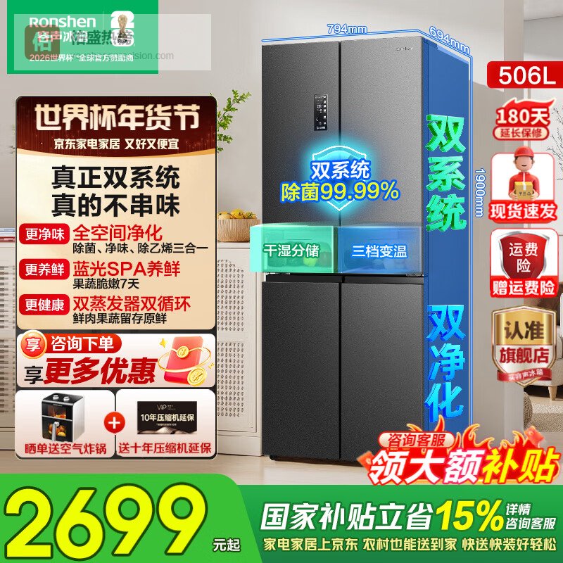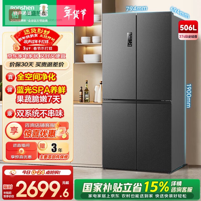 容声506升双系统双循环十字对开四开门电冰箱家用一级能效节能变频风冷无霜BCD-506WD11FP国家补贴 BCD-506WD11FP灰色¥