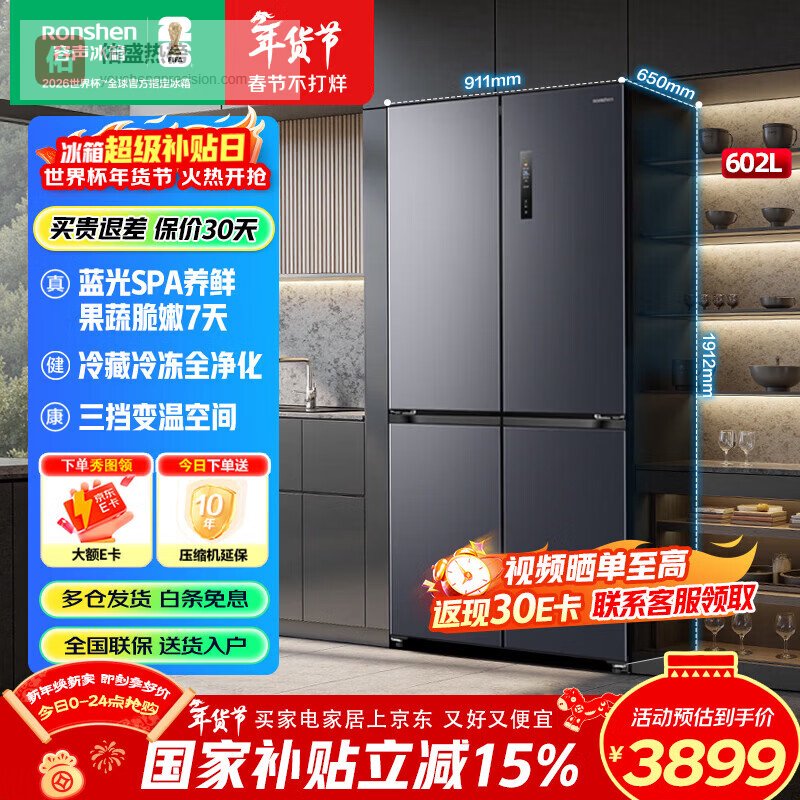 容声冰箱602升四开门十字对开门超大容量家用一级能效超薄变频风冷无霜除菌净味全生态养鲜国家补贴 【水蓝光系列】BCD-602D30CNLBP¥