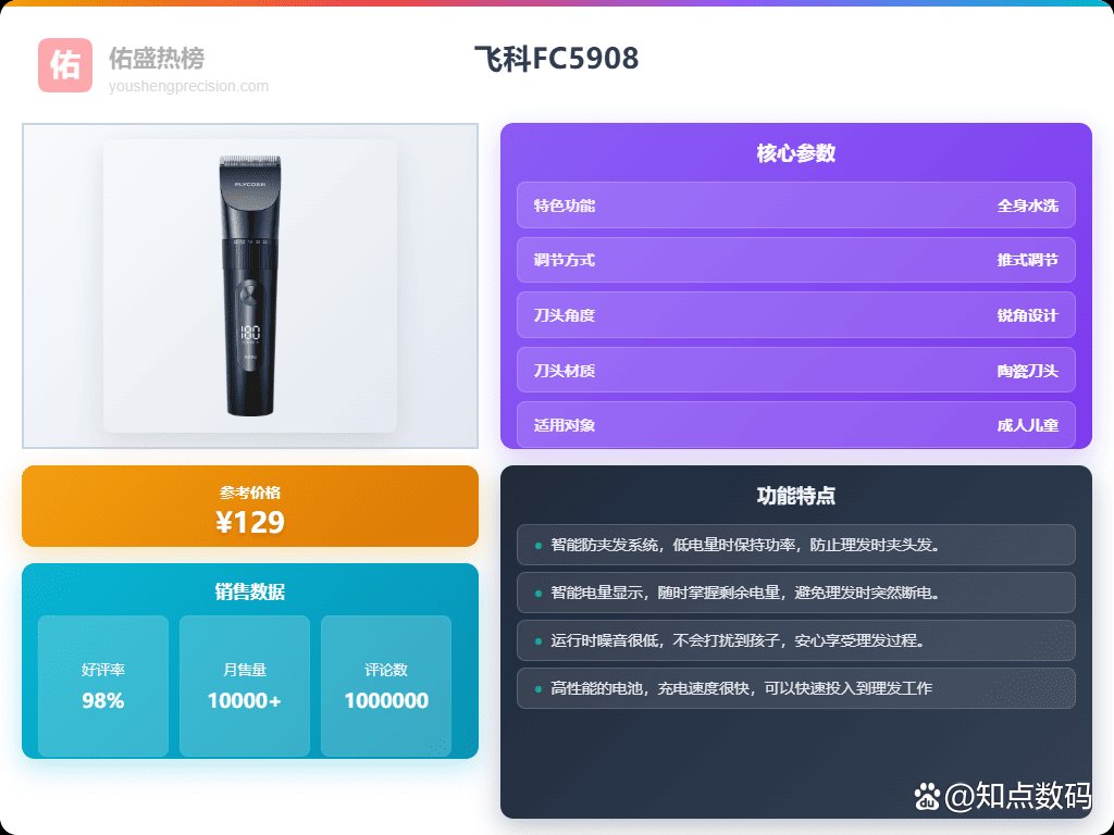 三、飞科① 防夹发设计:这款飞科FC5908理发器配备了防夹发功能,在理发过程中能有效防止夹发卡丝,让操作比传统理发器更顺畅,减少拉扯和不适,特别适合家庭中不同发质的成员使用。