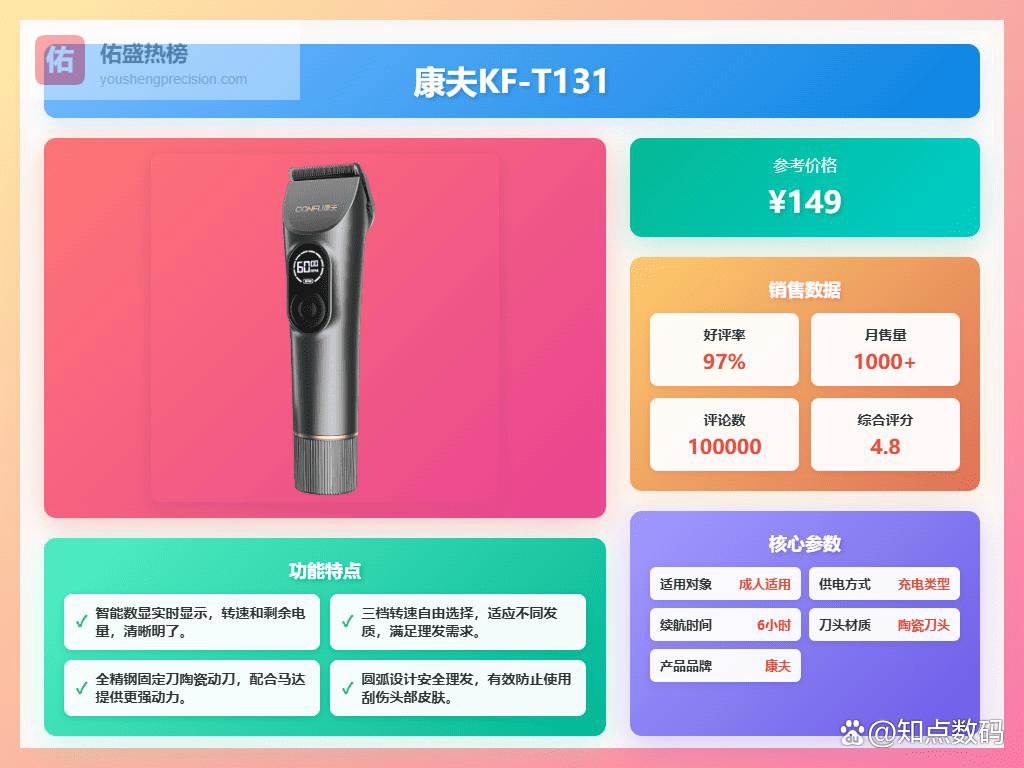 四、康夫① 低噪音设计:这款康夫KF-T131理发器采用了低音设计,最大噪音只有60分贝左右,几乎没有刺耳的噪音,理发的时候几乎听不到声音,让你在家也能轻松享受安静的理发体验,特别适合怕吵或者有宝宝的家庭。