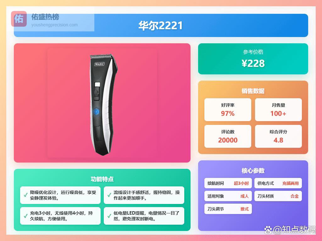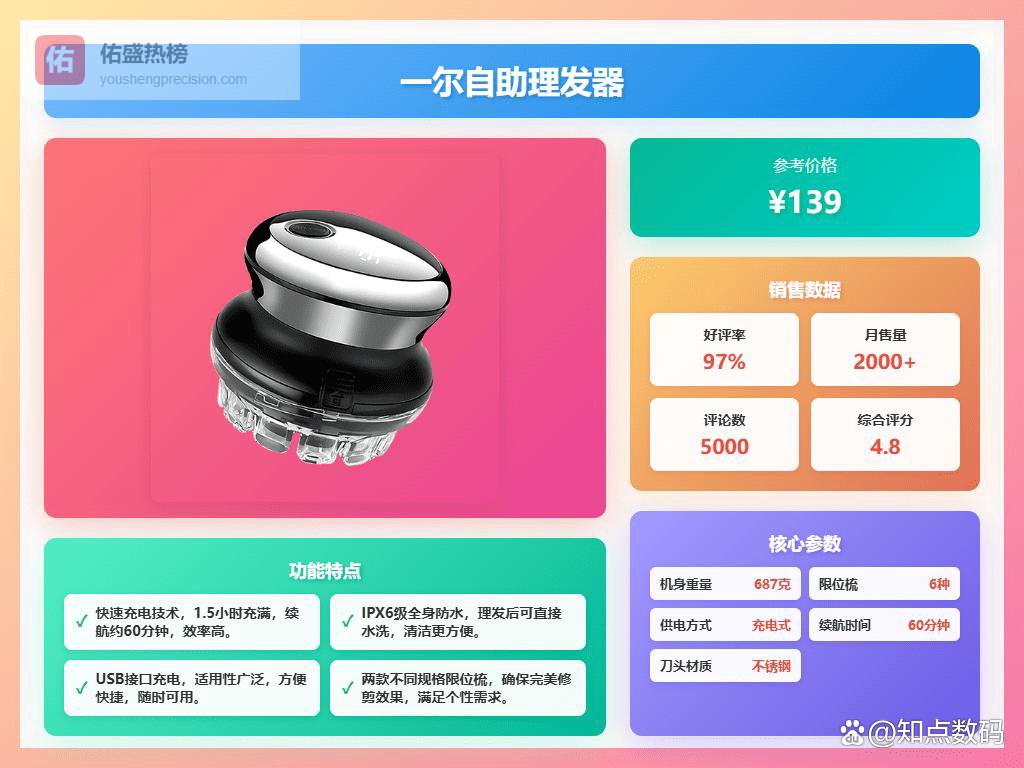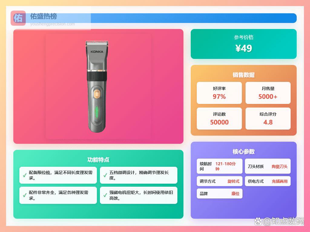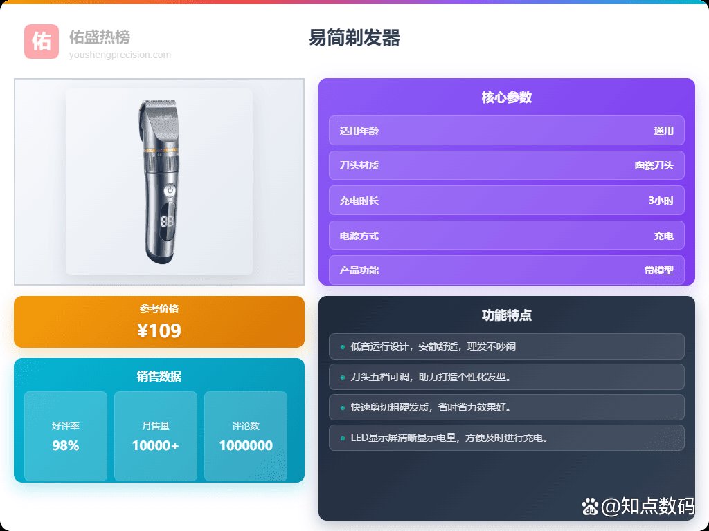 说实话,之前选理发器,我最看重的就是安全性和操作是否简单,毕竟不是专业理发师嘛。现在科技这么发达,理发器也越来越智能,像什么防夹发、低噪音,甚至还有各种造型功能,简直是手残党的福音!而且续航也越来越给力,充一次电用好几次都没问题。当然,刀头锋利度也很重要,不然推半天都推不干净,体验感直接拉低。下面给大家挑了10款,感兴趣的可以了解下。