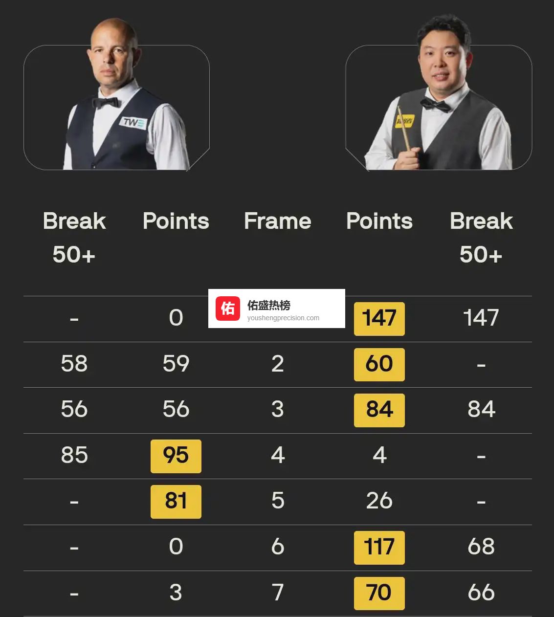 第四局,艾伦单杆打出69分以77:0拿下此局3-1领先高阳扩大优势。第五局,高阳以51:36艰难拿下此局2-3落后艾伦。第六局,艾伦单杆打出59分以63:33赢下此局并4-2领先高阳。