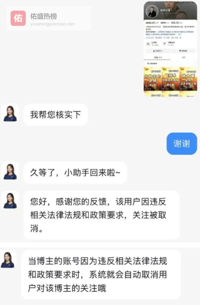 更值得注意的是,平台客服给出的回应,用词极其明确:“该账号因违反相关法律法规和平台政策要求,相关关注已被取消。”