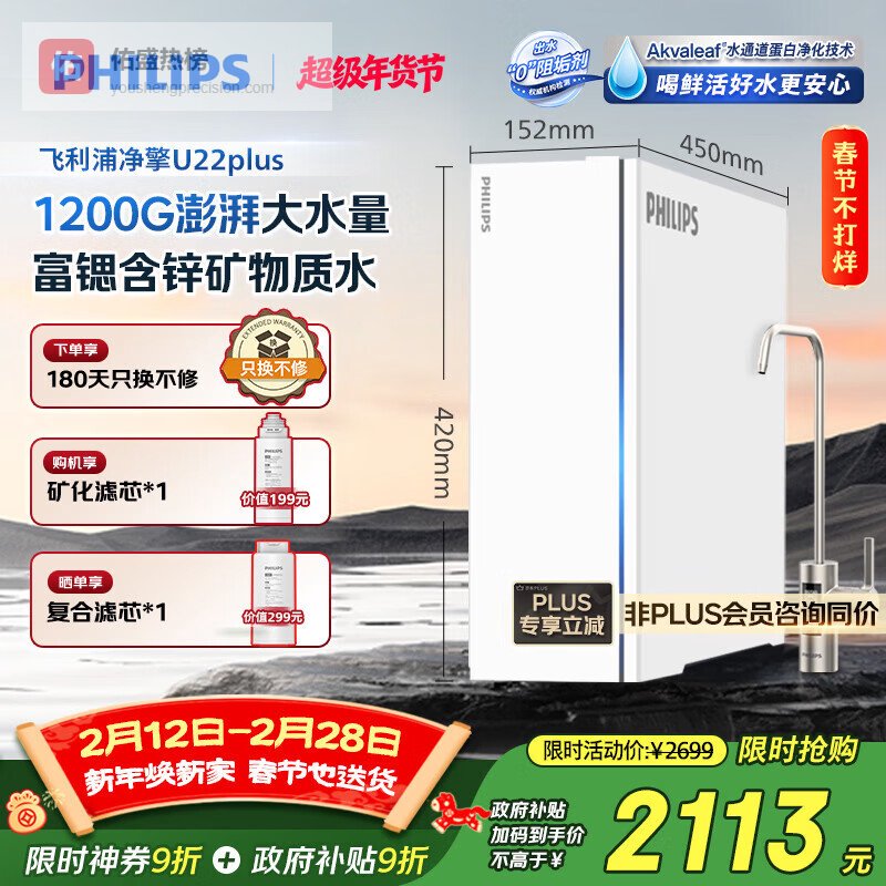 飞利浦(PHILIPS)净水器家用净擎U22plus 5年RO反渗透富锶含锌3.1L/分流量1200G直饮机AUT8000¥