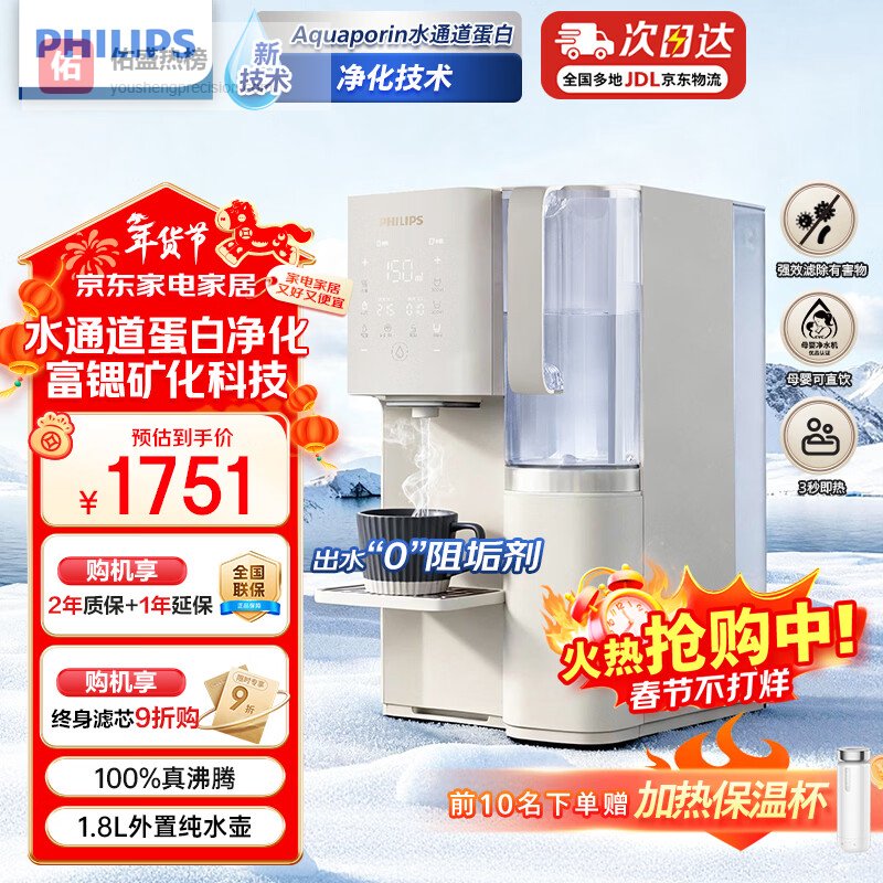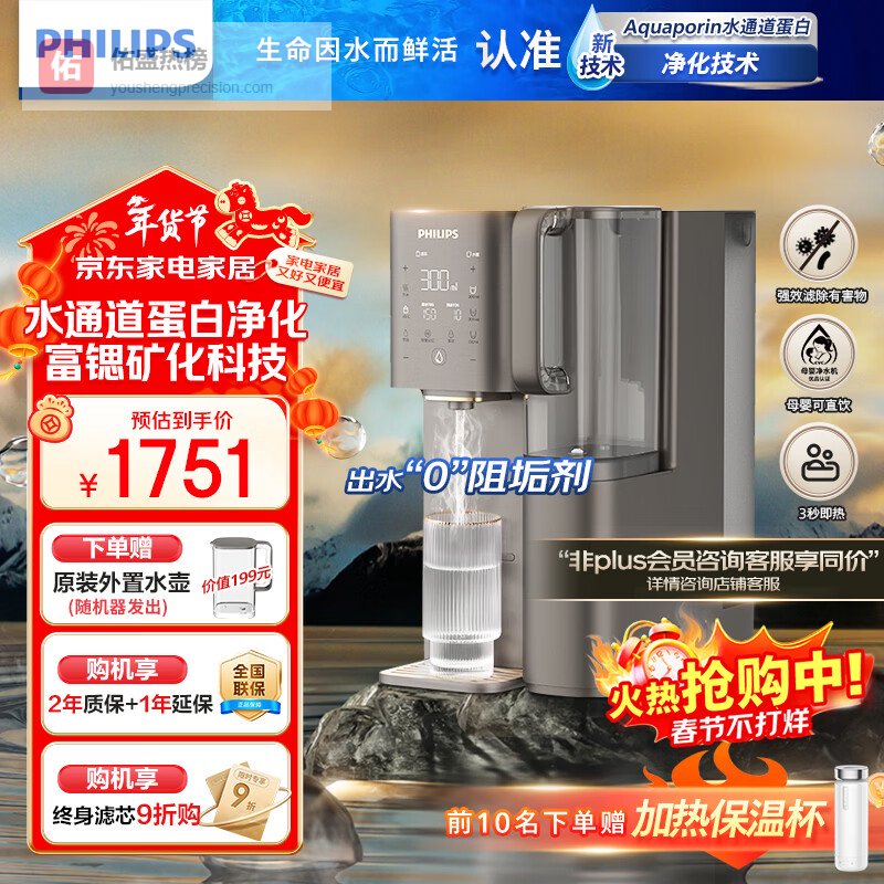 飞利浦净水器家用净化加热直饮一体机RO反渗透净饮机富锶矿化免安装台式即热式饮水机 水通道蛋白ADD8638 升级款一级水效ADD8638¥